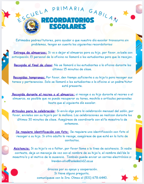 School Reminders / Recordatorios Escolares